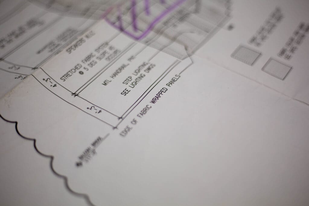 Since the theater is curved, the fabric was essentially used as a floating false wall. All the absorption, barrel diffusers, and hard panels, in addition to lighting and electrical elements, were able to be tucked in behind the fabric façade.